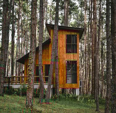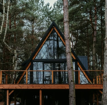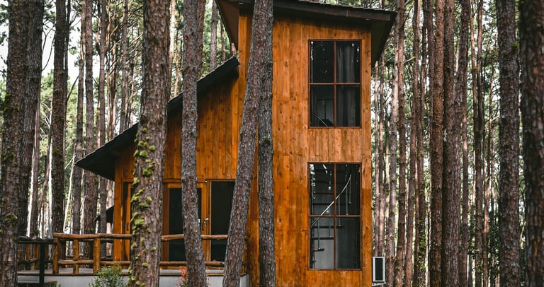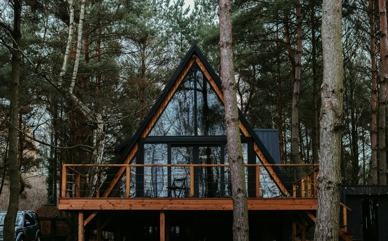 A cozy wooden hideaway surrounded by pine trees – where warmth meets simplicity.